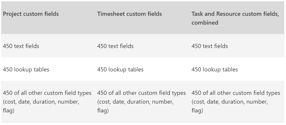 Project Online สามารถเก็บข้อมูลของคุณได้สูงสุดตาม limit ดังต่อไปนี้
