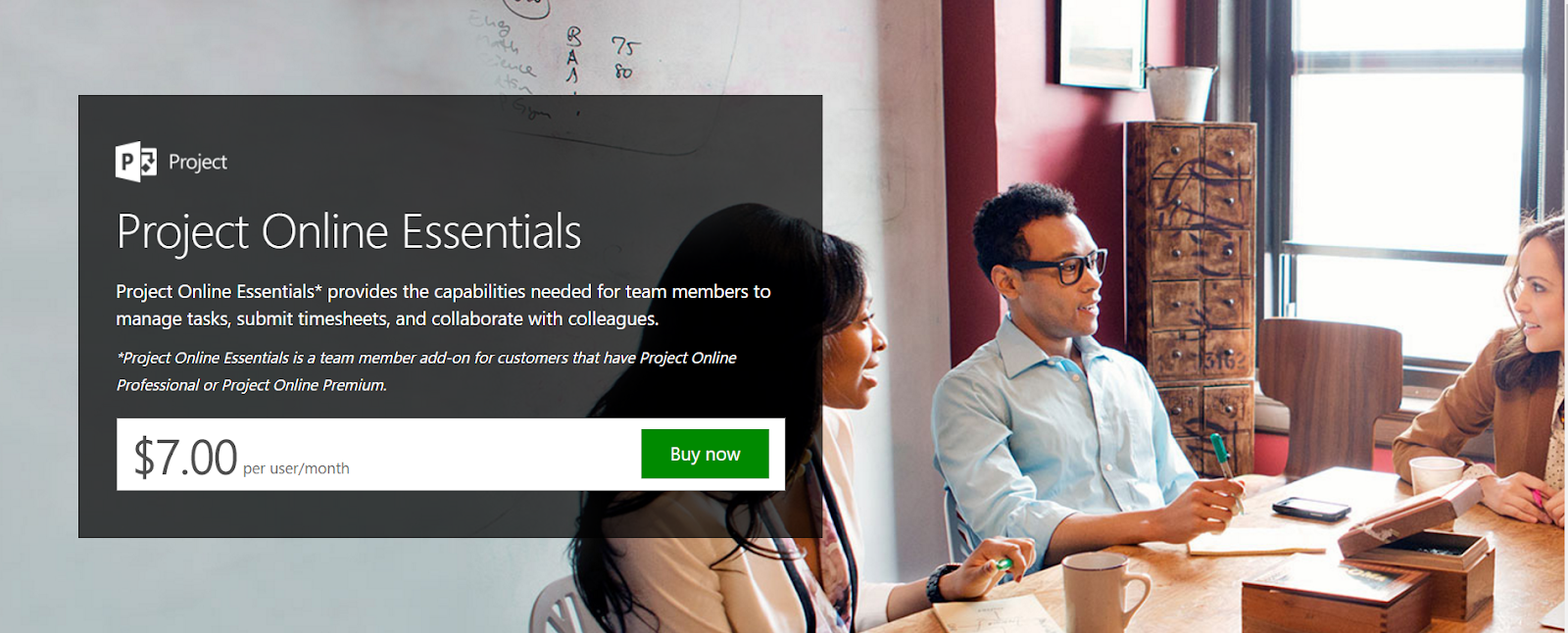 Project Online Essentials เป็น team member add-on สำหรับลูกค้าที่ใช้งาน Project Online Professional หรือ Project Online Premium อยู่แล้ว โดยมอบความสามารถที่เฉพาะ Team Members เท่านั้นเช่นจัดการ Task หรือ Submit Timesheet หรือประสานงานร่วมกับทีมงาน