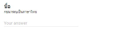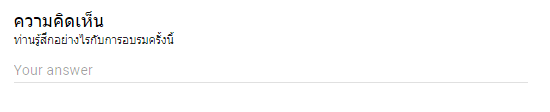 เป็นฟอร์มสำหรับกรอกข้อความสั้นๆ ลงไปในช่องคำตอบ เช่น ชื่อ – นามสกุล หรืออีเมล์ เป็นต้น กรณีต้องการกรองรูปแบบของคำตอบ เช่นต้องเป็นตัวเลขเท่านั้น หรือต้องเป็นรูปแบบของอีเมล์เท่านั้น หรือหากต้องการรูปแบบการกรองคำตอบให้มีความสามารถมากขึ้น ก็สามารถใช้วิธีการ Regular expression ก็ได้ โดยกด