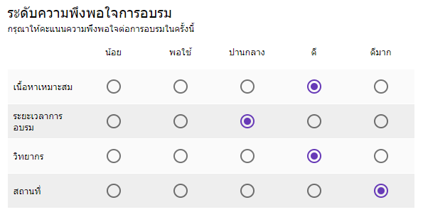 เป็นฟอร์มสำหรับสร้างคำตอบแบบตัวเลือกในรูปแบบตาราง เหมาะกับการใช้งานกรณีที่มีหลายคำถามโดยที่มีชุดคำตอบเป็นชุดเดียวกัน ผู้ตอบสามารถเลือกตอบได้แค่คำตอบเดียวเท่านั้นในแต่ละคำถาม ยกตัวอย่างเช่น แบบประเมินการจัดฝึกอบรม