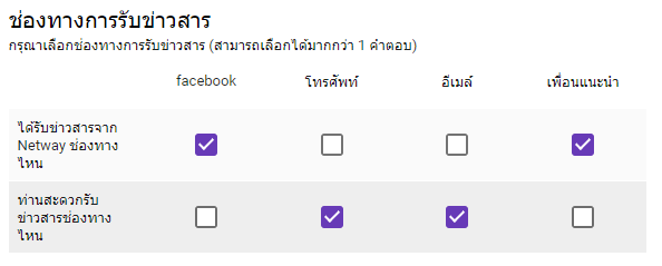 จะเป็นฟอร์มสำหรับสร้างคำตอบแบบตัวเลือกในรูปแบบตาราง คล้ายๆกับ Multiple choice grid แต่จะต่างกันตรงที่รูปแบบนี้สามารถเลือกได้หลายคำตอบ