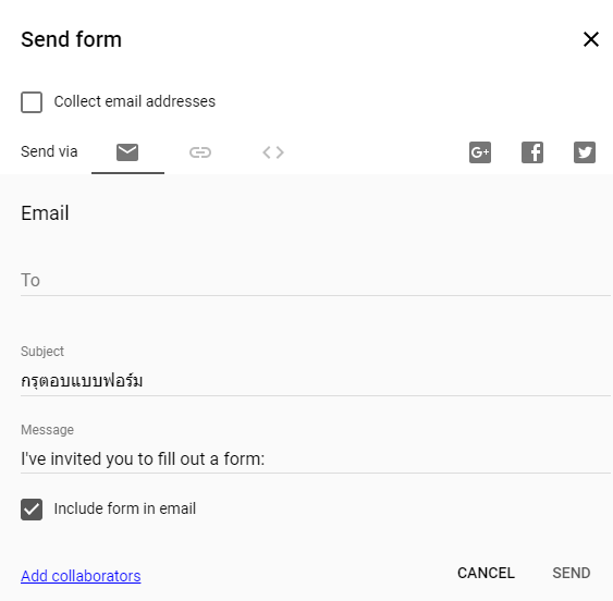5. ขั้นตอนในการส่งแบบฟอร์มเพื่อให้คนตอบแบบฟอร์มได้รับ ให้กดปุ่ม send ที่อยู่มุมขวาบนของหน้าสร้างแบบฟอร์ม โดยสามารถเลือกรูปแบบการส่งได้หลายแบบ เช่น ส่งผ่านอีเมล์, แนบ link, เพิ่มเข้าไปในเว็บไซต์โดยใช้ iFrame หรือแม้แต่ส่งผ่านทาช่องทาง Social media ก็ได้