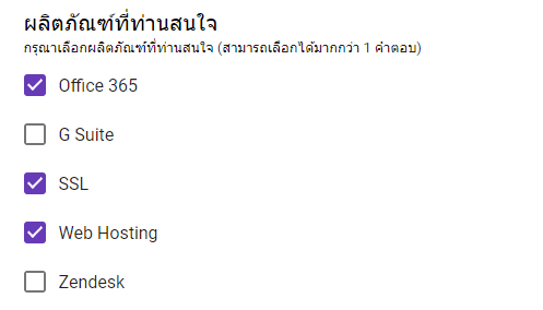 เป็นฟอร์มสำหรับสร้างคำตอบแบบตัวเลือก แต่ต่างจากแบบ Multiple Choice ตรงที่ผู้ตอบสามารถเลือกตอบได้มากกว่า 1 คำตอบ เช่น สอบถามความสนใจของผลิตภัณฑ์