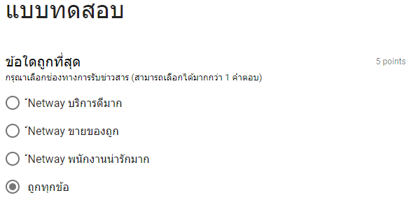 Google Form ยังมีมากกว่าแค่ทำฟอร์มนะครับ Google Form ยังมีความสามารถในการสร้างแบทดสอบออนไลน์ก็ได้ ท่านสามารถระบุคะแนนของแต่ละคำตอบได้ และระบบสามารถออกคะแนนให้ได้ทันทีเมื่อตอบคำถามเสร็จแล้ว โดยให้เลือกรูปแบบของ Form เป็น Quizzes ที่เมนู