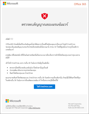 เมื่อ Microsoft 365 ตรวจพบการโจมตีของ ransomware คุณจะได้รับการแจ้งเตือนบนอุปกรณ์ของคุณและได้รับอีเมลจาก Microsoft 365 ถ้าคุณไม่ได้เป็นผู้สมัครใช้งานการแจ้งเตือนและการกู้คืนแรกของคุณให้เป็นแบบฟรี คลิกเพื่อดูรายละเอียดบริการ