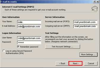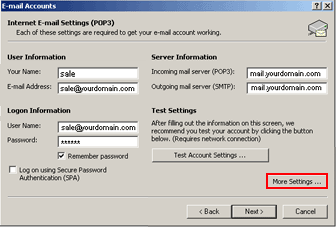 User Name : ชื่อสำหรับ E-mail Account ของคุณ เช่น sale@yourdomain.com ให้ใช้ชื่อ email address แบบเต็ม ๆ ของคุณ ยกเว้นdefault email (ชื่อเดียวกับ username ที่คุณใช้ในการเข้าสู่ control panel หรือ ftp) ที่ใส่เฉพาะชื่อเท่านั้น