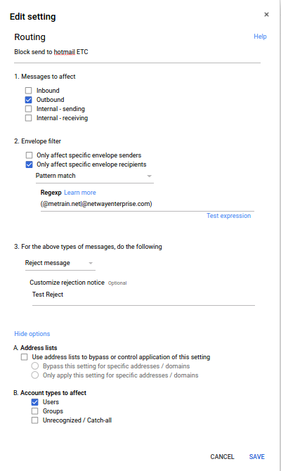 - เลือก Pattern match ในกรณีต้องการใส่โดเมนให้ใส่ @domain.com หรือหากต้องการ Block หลาย Domain สามารถใส่เป็นค่า Regxp เช่น (@netway.co.th|@gmail.com|@hotmail.com) เป็นต้น