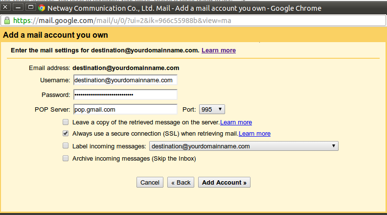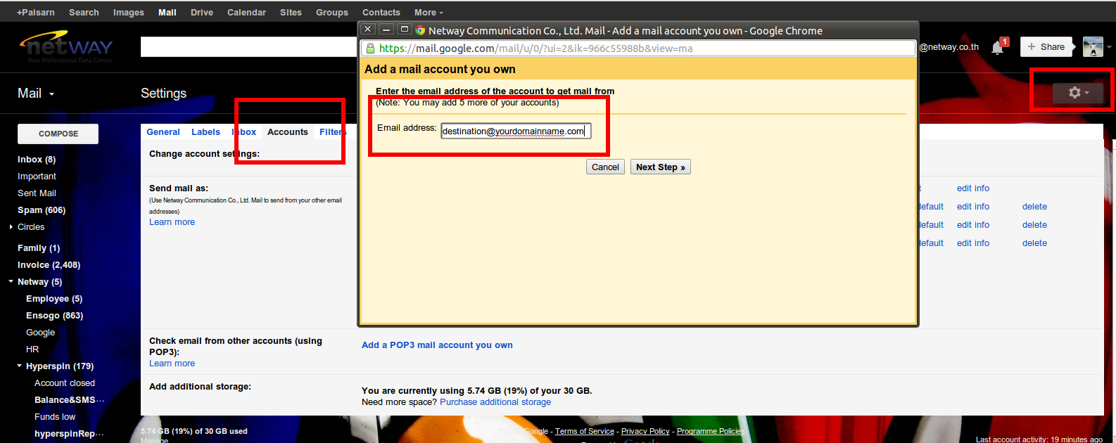 3. ที่หัวข้อ "Check mail from other accounts" คลิ๊กที่ “Add a mail account” จะพบหน้าต่างใหม่ขึ้นมา
