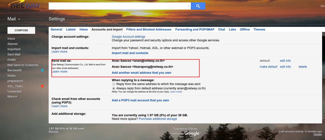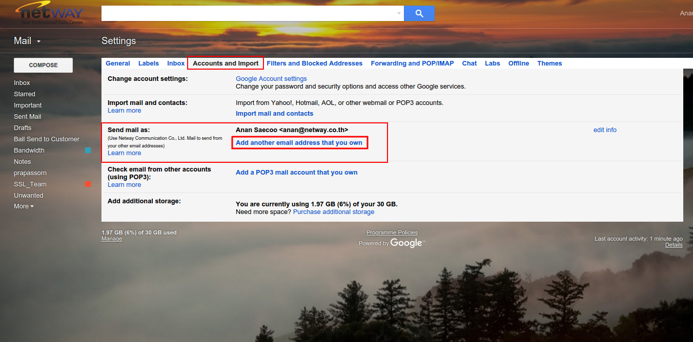 2. หลังจากนั้น ให้ไปที่หัวข้อ Account and Import > Send mail as และเลือก Add another email address that your own