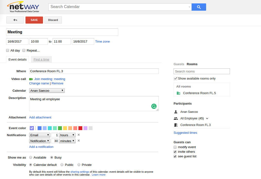 เมื่อใส่ข้อมูลเสร็จเรียบร้อยแล้วกด Save เป็นอันเสร็จสิ้นขั้นตอนการสร้างนัดหมายและจองห้องประชุมในการใช้งาน
