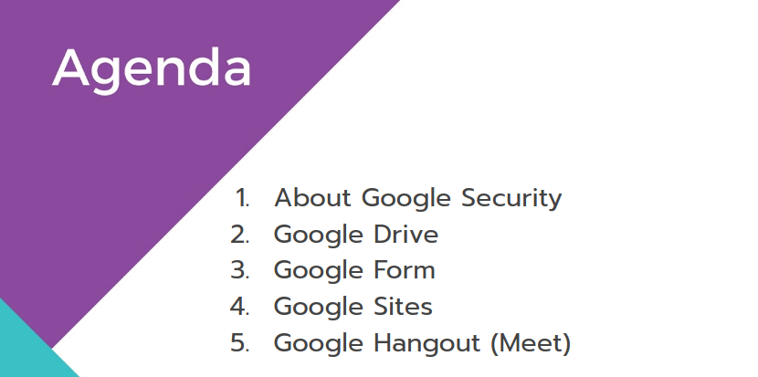 ประเด็นหลักของเนื้อหาในครั้งนี้ คงไม่พ้นเรื่องของ Security ที่ในปัจจุบันนี้ มีความสำคัญ และควรให้ความสำคัญอย่างมากที่สุด และลำดับถัดมาคือเรื่องของฟีเจอร์ต่างๆ ที่มีอยู่ใน GSuite โดยงานในครั้งนี้ ทางเราพูดถึงเรื่องอะไรบ้าง ดูตาม Agenda ด้านล่างนี้ได้เลย