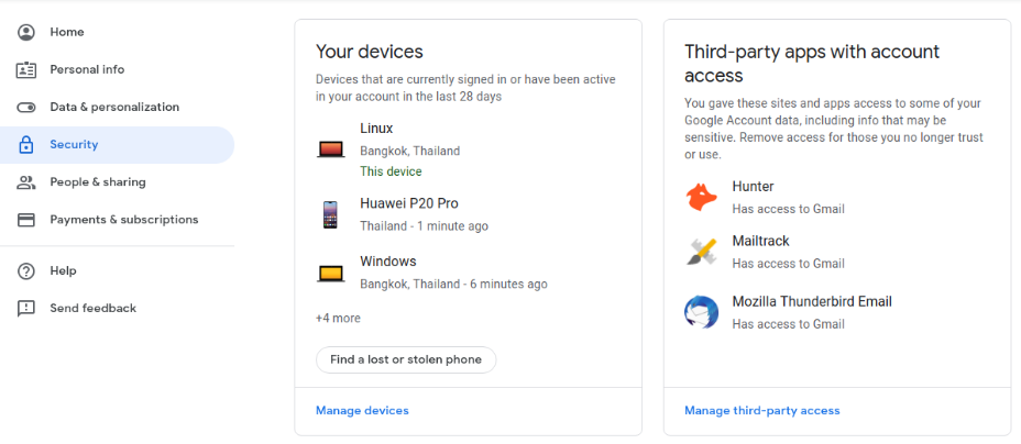 2. Google Security check เป็นวิธีการตรวจสอบเรื่องของความปลอดภัยของท่าน ในกรณีถูกลงชื่อเข้าใช้งานจากที่อื่น หรือตรวจสอบว่า Account ของท่านปลอดภัยมากน้อยแค่ใด แถมยังมีเมนูช่วยเหลือในกรณี Smartphone สูญหาย ชื่อเมนูว่า "Find a lost or stolen phone" ซึ่งถ้าหากท่านใดใช้งาน Android Smart phone อาจจะเคยใช้งานมาบ้าง