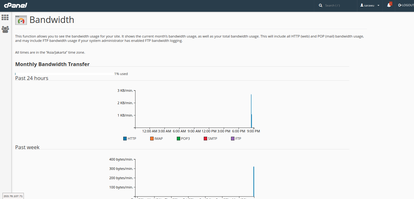 ข้อมูลทางสถิติที่แสดงนี้รวมถึงปริมาณข้อมูลเข้าออกของ HTTP, SMTP, FTP และ POP3 ด้วย และจะมีการ update ข้อมูลทุกๆ 6 ชั่วโมง เมื่อคุณเลือกดู "ปริมาณข้อมูลเข้าออก" ระบบจะแสดงกราฟข้อมูลเข้าออกโดเมนของคุณ โดยที่ชื่อโดเมนก็จะเป็นชื่อโดเมนของคุณ ( จะเป็น yourdomain.com )