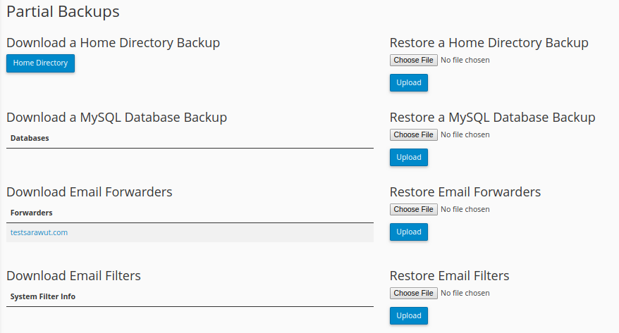 ระบบจะมีไฟล์ให้เลือกว่าท่านต้องการจะ Backup ข้อมูลใด เช่น Home Directory, Database นอกจากนั้นยังสามารถทำการกู้คืนไฟล์เข้าสู่ระบบ โดยนำไฟล์ที่ทำสำเนาเอาไว้แล้วอัพโหลดเข้าสู่ Directory ที่เราต้องการได้