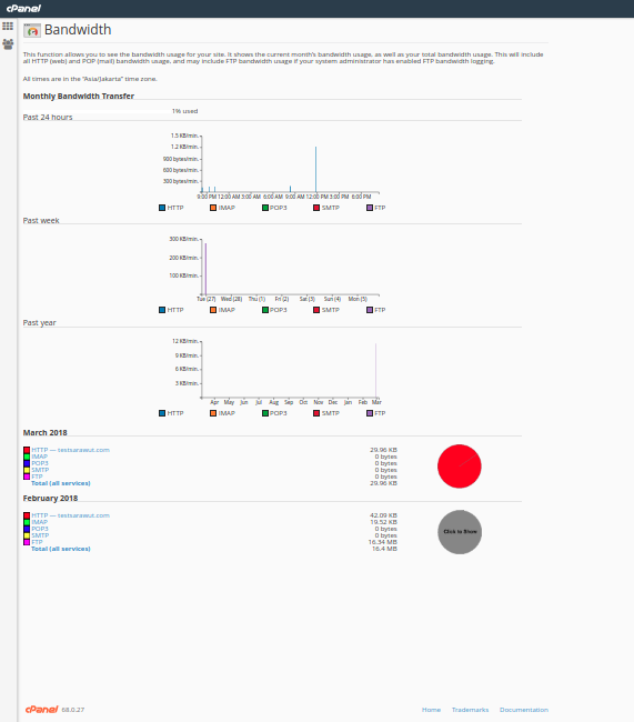 ข้อมูลทางสถิติที่แสดงนี้รวมถึงปริมาณข้อมูลเข้าออกของ HTTP, SMTP, FTP และ POP3 ด้วย และจะมีการ update ข้อมูลทุกๆ 6 ชั่วโมง เมื่อคุณเลือกดู "ปริมาณข้อมูลเข้าออก" ระบบจะแสดงกราฟข้อมูลเข้าออกโดเมนของคุณ โดยที่ชื่อโดเมนก็จะเป็นชื่อโดเมนของคุณ ( จะเป็น yourdomain.com )