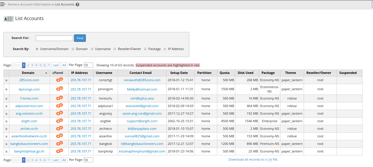 2. List Accounts - เมนูแสดงรายการโดเมนที่ใช้งานอยู่บนเครื่อง Server ทั้งหมด