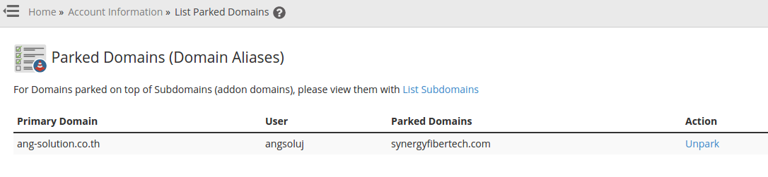 3. List Parked Domains - เมนูแสดงรายการโดเมนที่ใช้งานร่วมกับโดเมนหลัก