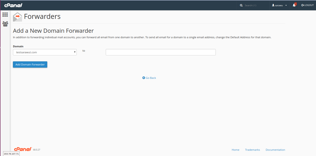 การตั้งค่า Email Forwarding แบบ Domain เช่นจาก domain.com ไปที่ testdomain.com ในส่วนนี้ให้ทำการเลือกที่เมนู Add Domain Forwarder
