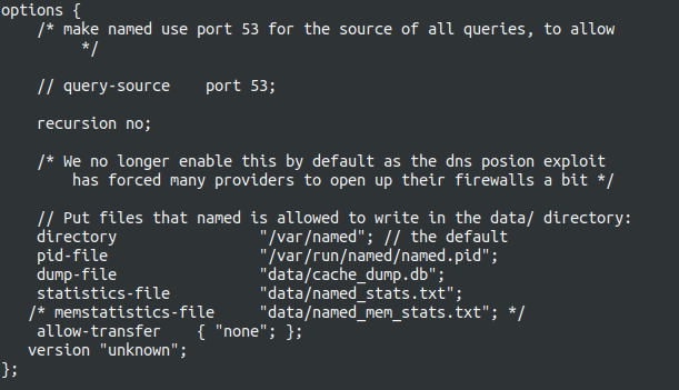 ให้ทำการเพิ่มค่า version "unknown"; ในส่วนของ options ตามรูปด้านล่าง แล้วทำการ restart service named