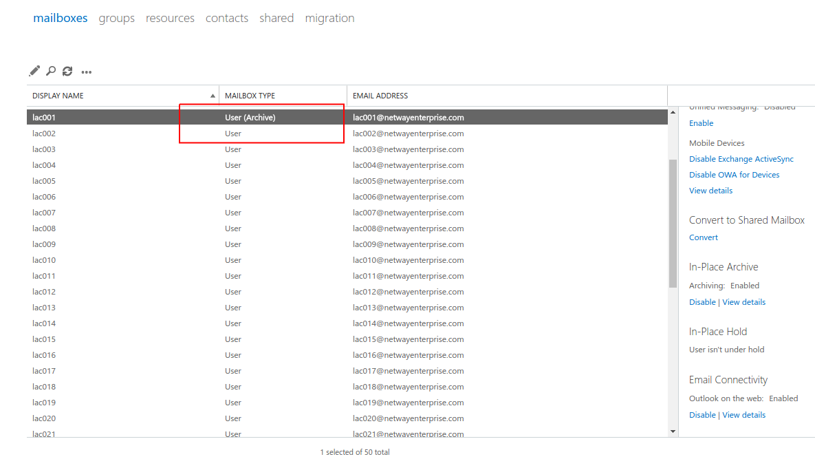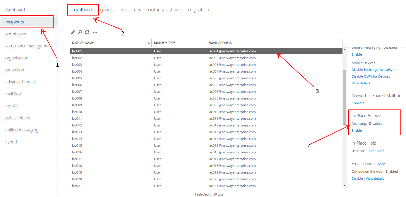 3. ไปที่เมนู recipients > mailboxes เลือก user ที่ต้องการเปิดใช้งาน Archive
