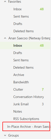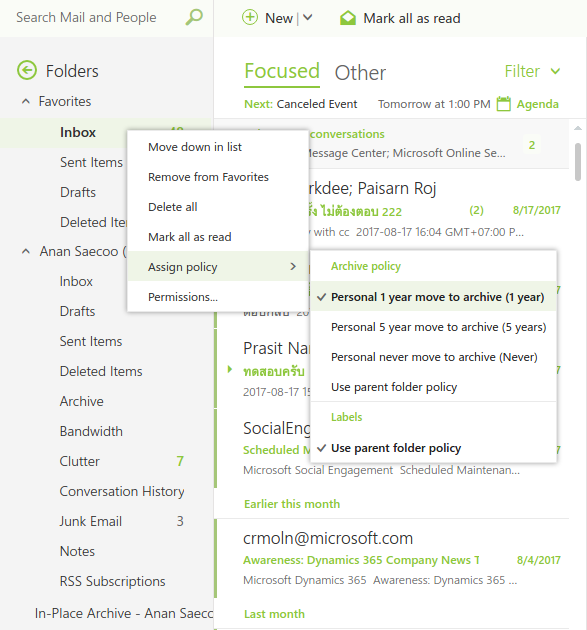 5. เมื่อเข้าไปดูในหน้าใช้งาน Email จะขึ้นเมนู In-Place Archive ขึ้นมาให้ใช้งาน