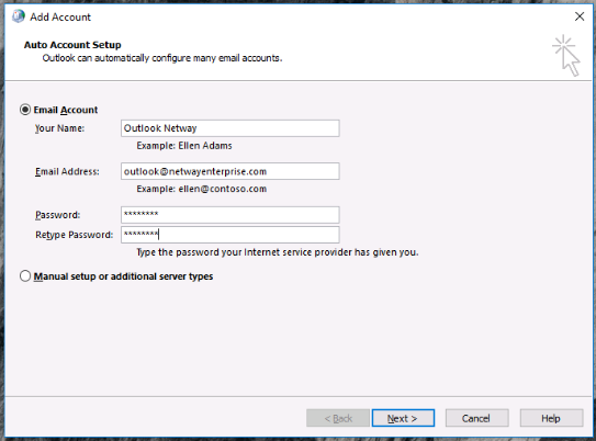 1. เมื่อเปิด Outlook แล้วเข้าไปที่ File > Add account จะขึ้นหน้าต่างดังรูป ให้ใส่ ข้อมูลในส่วนของ Email Account ให้ครบถ้วน หลังจากนั้นกด Next
