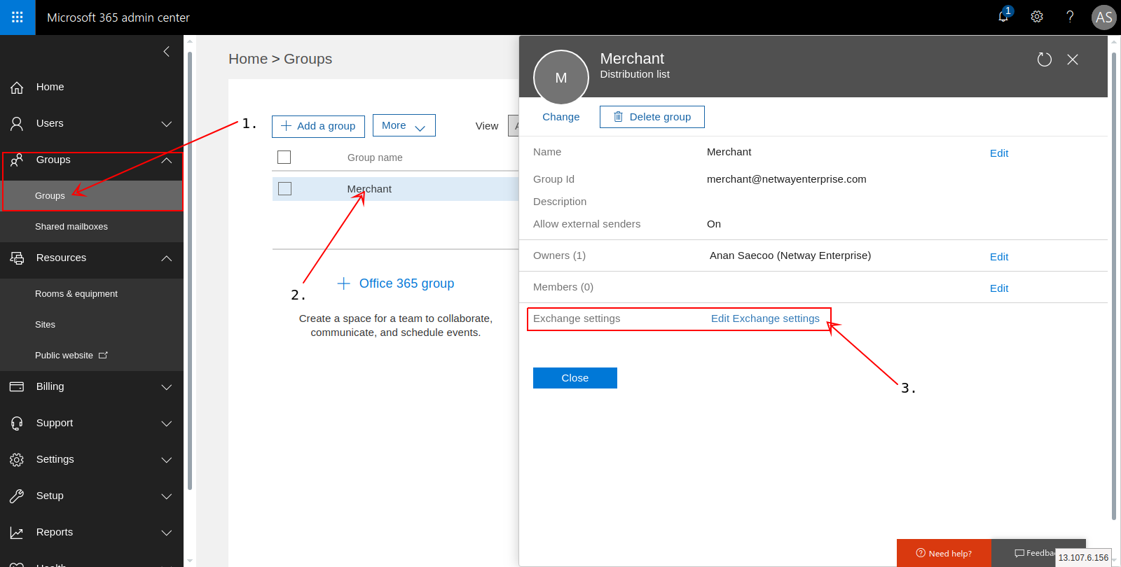 2. หากเป็น Group ให้เข้าไปยังเมนู Groups > Groups และเลือก Groups ที่ต้องการตั้งค่า จากนั้นเลือก Edit Exchange settings