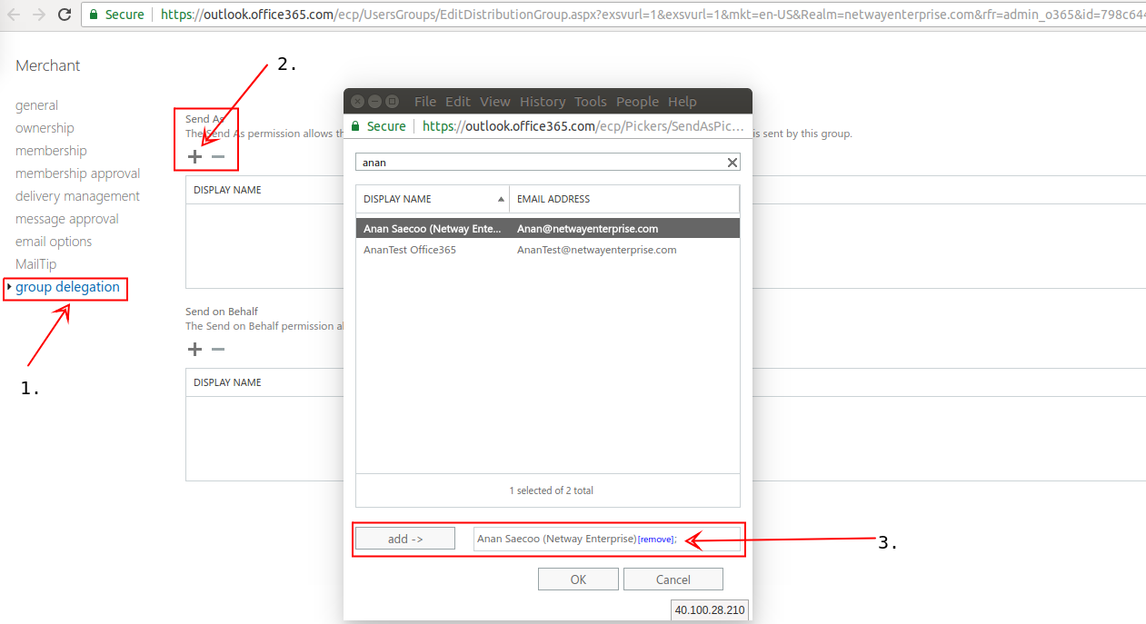 4. ในส่วนของ Send As กดรูป + และเพิ่ม User ที่จะมีสิทธิ์ส่งผ่าน Email ดังกล่าวเข้าไป