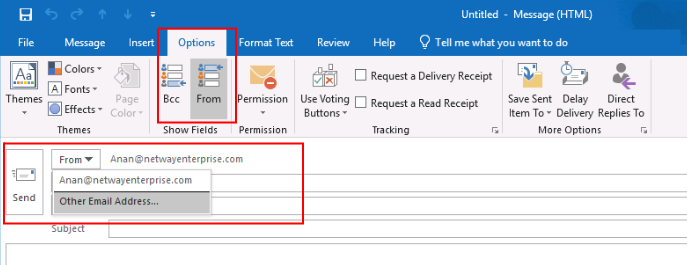 2. เลื่อนไปที่แถบ Option และเลือก From เมนู From จะเพิ่มขึ้นมา จากนั้นกดที่ From และเลือก Other Email Address