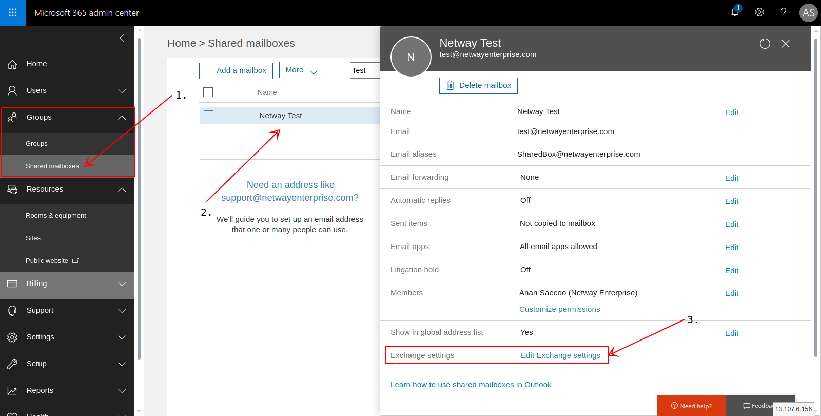 หากเป็น Shared Mailboxes ให้เข้าสู่ Groups > Shared mailboxes และเลือก Shared mailboxes ที่ต้องการตั้งค่า และเลือก Edit Exchange settings