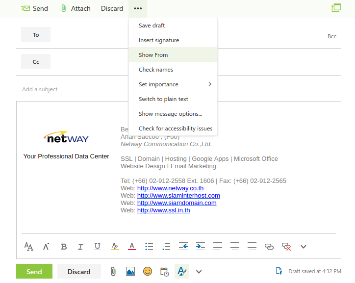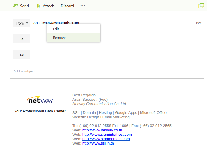 9. เลือกเมนูสร้าง Email ใหม่ ตั้งค่าให้ Show from ด้วยการกด ... ข้างปุ่ม Discard และเลือก Show from