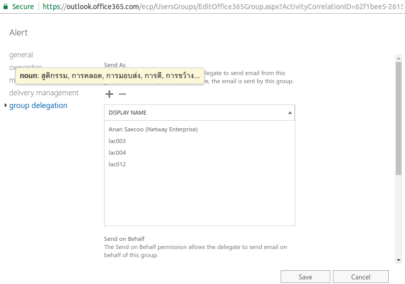 5. ด้านซ้ายมือ เลือก group delegation และเลือก + ที่หัวข้อ Send As