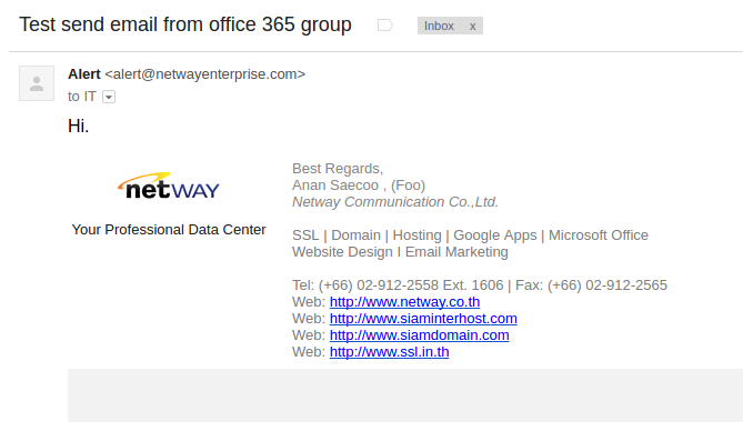 12. เมื่อตรวจสอบจาก Email ปลายทาง จะเห็นได้ว่า Email ถูกส่งไปในนาม Group email ไม่ใช่ User email