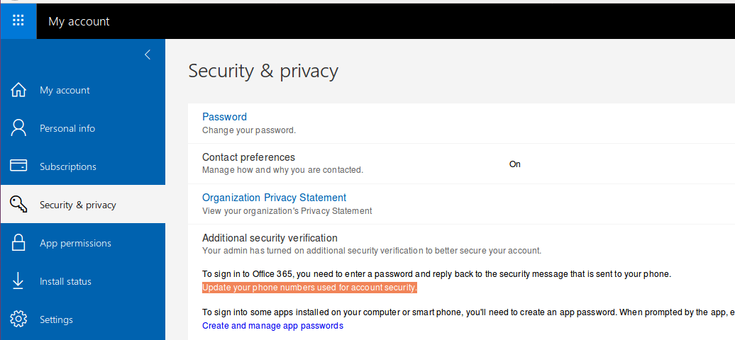8. หากต้องการเปลี่ยน Method ในการยืนยันตัวตนจาก SMS เป็น Application (Microsoft Authenticator) สามารถเข้าไปตั้งค่าเพิ่มเติมได้ที่ My account > Security & privacy > Additional security verification > Update your phone numbers used for account security.
