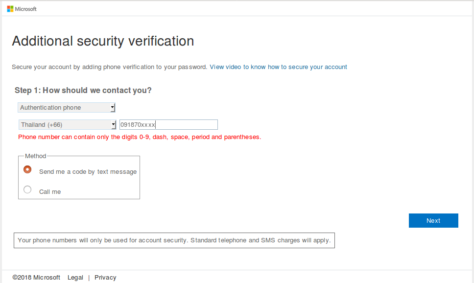5. เมื่อใส่เบอร์โทรศัพท์ถูกต้องแล้วเลือกประเทศ และเลือก Method ให้กด Next