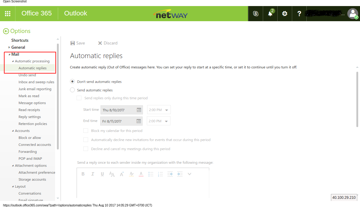 4. เลือก Send automatic replies เพื่อเปิดใช้งานและตั้งค่าตามความต้องการของผู้ใช้