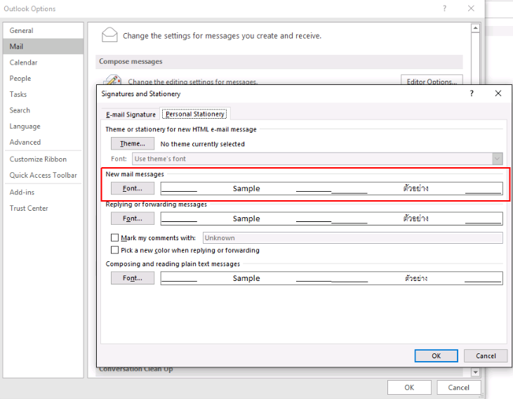 3. จากนั้น ให้ไปสู่ Tab “Personal Stationary” และกดปุ่ม Font… ภายใต้หัวข้อ “New mail messages”
