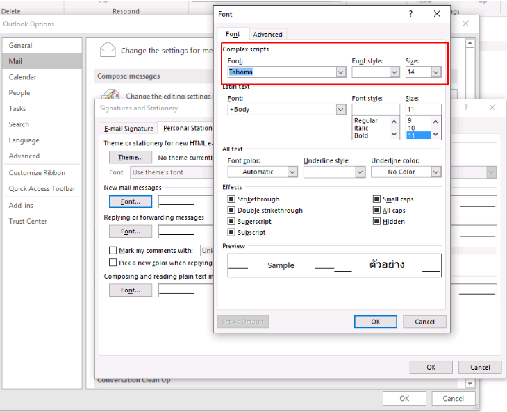 4. จากนั้น ให้ดูในส่วนของ “Complex script” และเปลี่ยน Font เป็น Angsana หรือ Tahoma จากนั้นกด OK