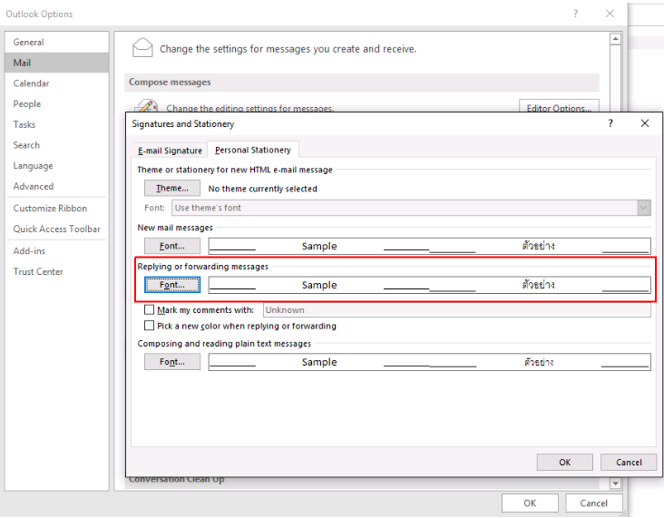 5. จากนั้น ในหน้า Signatures And Stationary ให้เลือก Font… ในส่วนของ Replying or forwarding messages