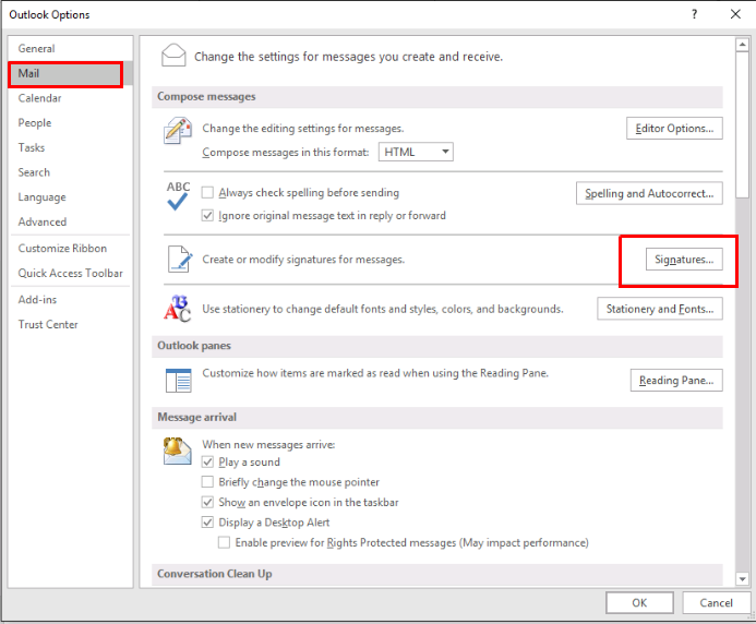 2. เลือกเมนูในส่วนของ Mail และเลือก Signatures… ในส่วนของ “Create or modify signature for message.”