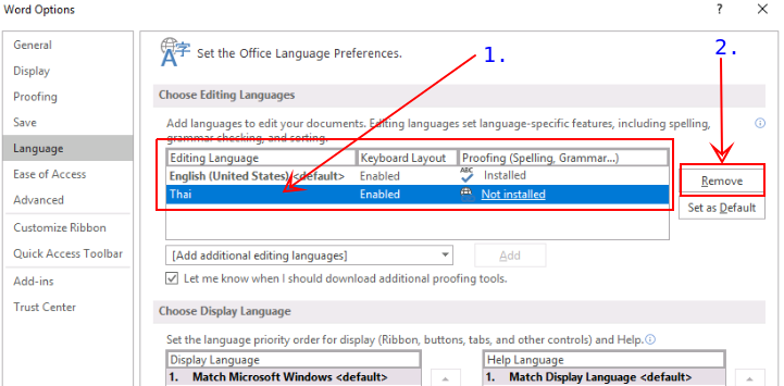 2. จากนั้นในหัวข้อ Choose Editing Languages เลือกช่องภาษา Thai และเลือก Remove