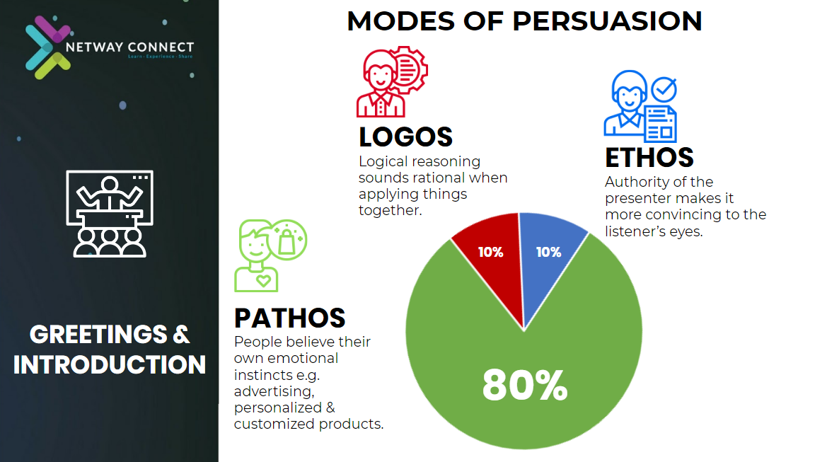 จริงๆ แล้วไม่มีอะไรยากนะครับ แค่เราต้องมองในส่วนของความน่าเชื่อถือ 3 ส่วน ไม่ว่าจะ Logic, Emotion และ Ego ของผู้นำเสนอ อย่าลืมว่าคนเราตัดสินใจซื้อไม่ใช่แค่เรื่องราคา แต่ความรู้สึกที่ประทับใจกับการนำเสนอ