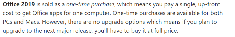 ในฝั่งของ Office 2019 เป็นซอฟต์แวร์ซื้อขาดตลอดชีพ จ่ายแล้วได้ซอฟต์แวร์มา 1 ชุด ได้ App มาครบตามที่ Microsoft แจ้ง และกรณีของภาคธุรกิจขั้นต่ำคือ 5 ไลเซ็นส์นะครับ คือซื้อแล้วก็ได้ฟีเจอร์มาจำนวนหนึ่ง หากอยากได้ฟีเจอร์ใหม่ๆ จะต้องรอเวอร์ชั่นหน้าออกอีกทีแล้วค่อยซื้อใหม่ไปเลย เช่น ถ้าอนาคตมี Office 2021 ก็ไปซื้อใหม่อีกที แต่ถ้าใครชอบที่เวอร์ชั่น 2019 อยู่แล้ว ก็ใช้ต่อไปเรื่อยๆ ได้ไม่มีปัญหาอะไร เพียงแค่การ support ของเวอร์ชั่น 2019 เมื่อหมดอายุแล้วก็จะไม่มีใครช่วยเหลือกรณีโปรแกรมพังหรือหยุดการทำงานครับ