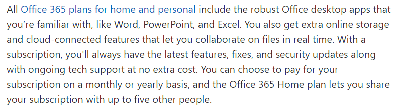 แต่ข้อเสียคือการต่ออายุบางทีอาจจะลำบาก และการยกเลิกผ่านบัตรก็ยากด้วยเช่นกัน และหากจะนำไปใช้กับธุรกิจหรือองค์กร เองเรื่องของ User name จะไม่สามารถเชื่อมต่อกับ domain name ขององค์กรได้ ต้องหันไปใช้กลุ่มของ Microsoft 365 Apps for business หรือ Microsoft 365 Apps for enterprise แทน