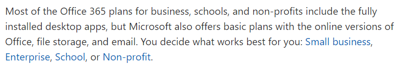 ในกลุ่มขององค์กรนั้น Microsoft 365 มีแบ่งแยกให้ชัดเจนว่าสำหรับการค้า การศึกษา ราชการ หรือ การกุศลและเชื่อมต่อกับ domain name ได้ ในกลุ่มนี้จะมีตัวเลือกให้หลากหลาย รวมทั้ง มีบาง License มอบให้ใช้งานฟรีในฝั่งของสสถาบันการศึกษา นักศึกษา และองค์กรไม่แสวงหาผลกำไรด้วย