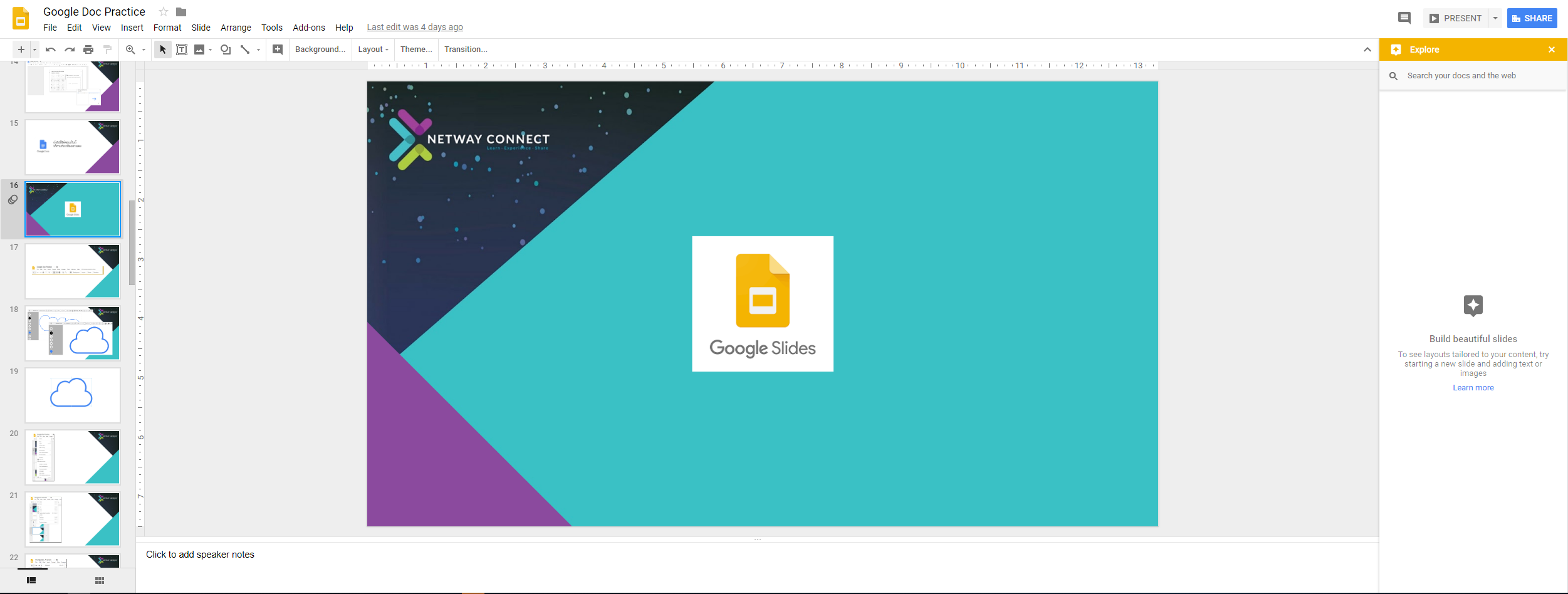สำหรับ Google Slide นั้น ตัว animation ยังไม่เยอะเท่า PowerPoint แต่ความสะดวกมันอยู่ที่การแทรกหน้าหน้าต่างที่ทำให้คุณค้นหาอะไรก็ได้จาก Slide แล้วแทรกเนื้อหาลงไปได้เลย ด้วยเมนู Explore ไม่ต้องแยกหน้าต่างมาเปิดค้นอีกที