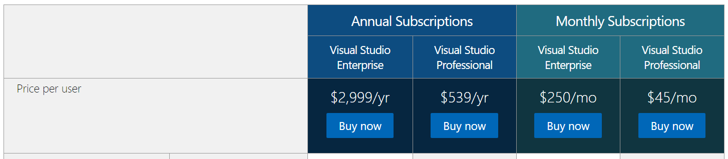 บน Visual Studio Subscription นั้นจะแบ่งเป็น 2 Editions คือ Professional และ Enterprise คิดค่าบริการรายปีดังนี้ครับ