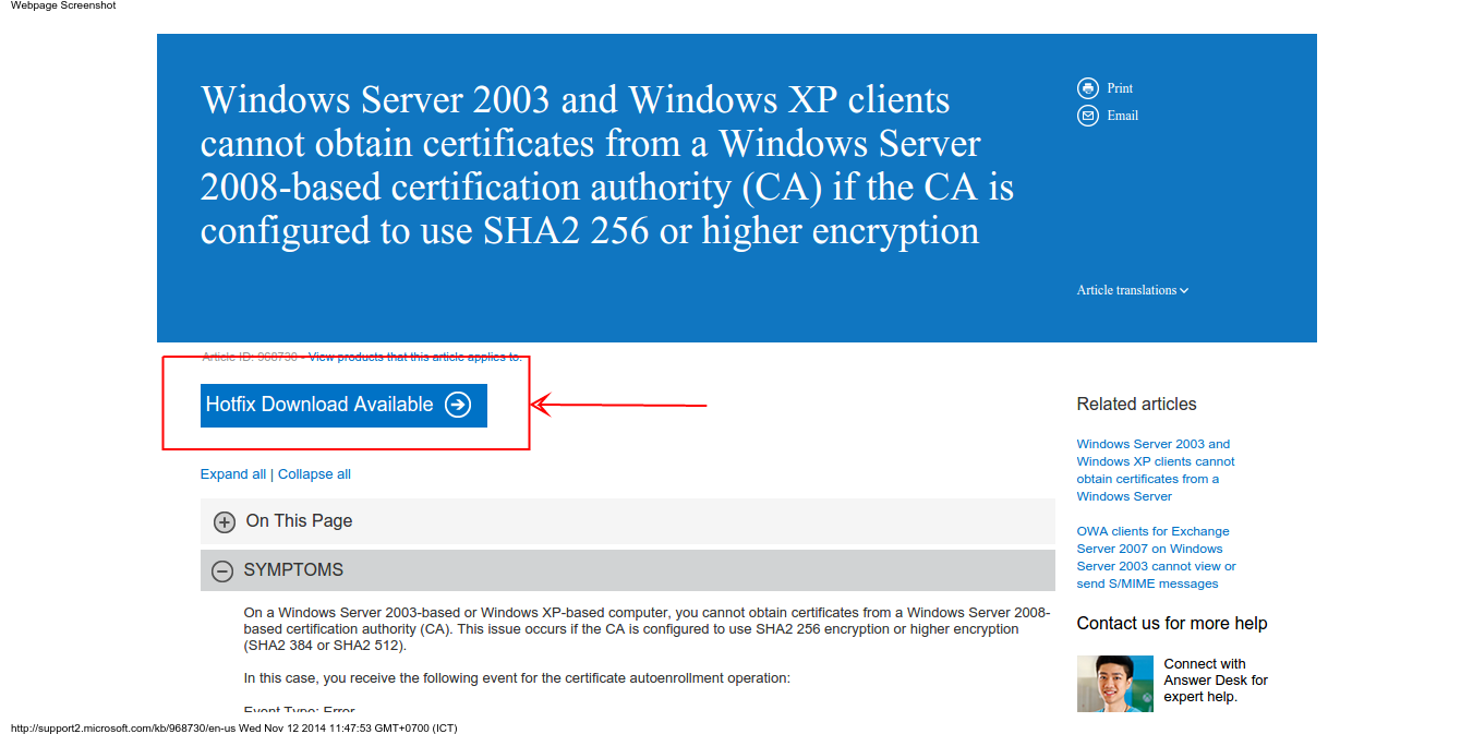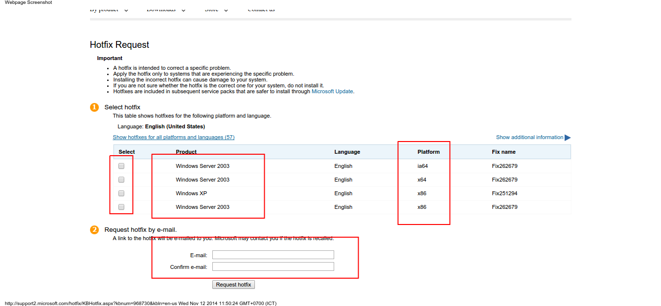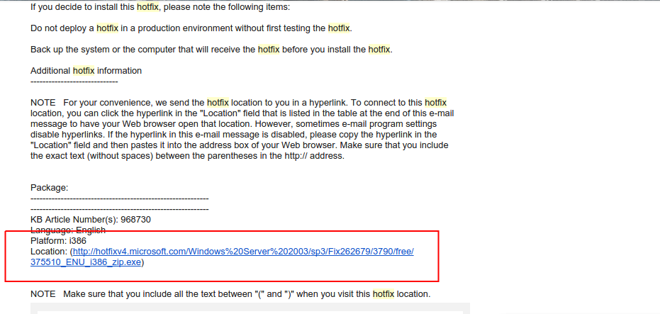 3. เมื่อได้รับ E-mail จากทาง Microsoft แล้ว ทำการเลือกหัวข้อตามกรอบสีแดง เพื่อทำการโหลด Hotfix ดังภาพ