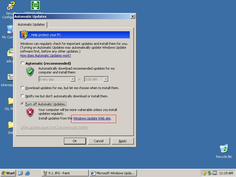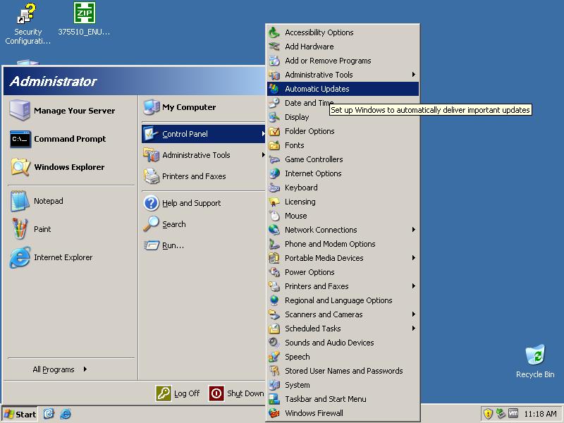2. เข้า Windows Update โดยไปที่ Start > Control Panel > Automatic Updates ดังภาพ