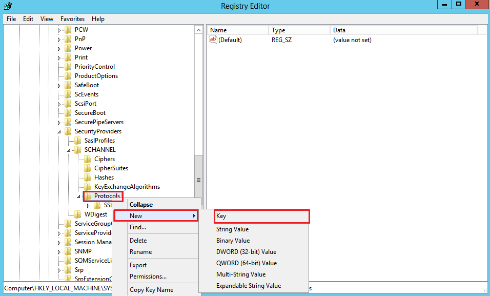 2. ในส่วนของ Registry Editor ไปที่ HKEY_LOCAL_MACHINE\SYSTEM\CurrentControlSet\Control\SecurityProviders\Schannel\Protocols\
